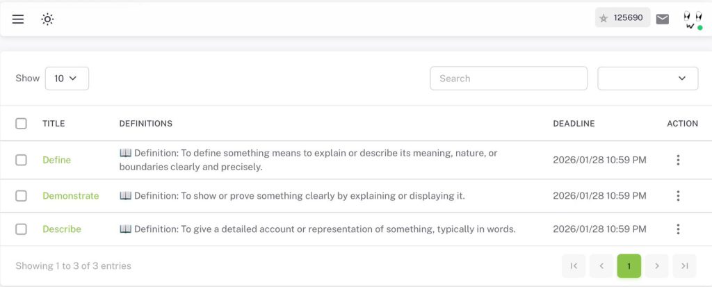 Active Management & Accountability: Students can search the bank and show a set number of entries (e.g., 10 per page) to navigate their personal vocabulary journey. The key feature of a DEADLINE turns passive learning into an active study plan, allowing the system or teacher to schedule reviews and promote long-term retention through spaced repetition.
